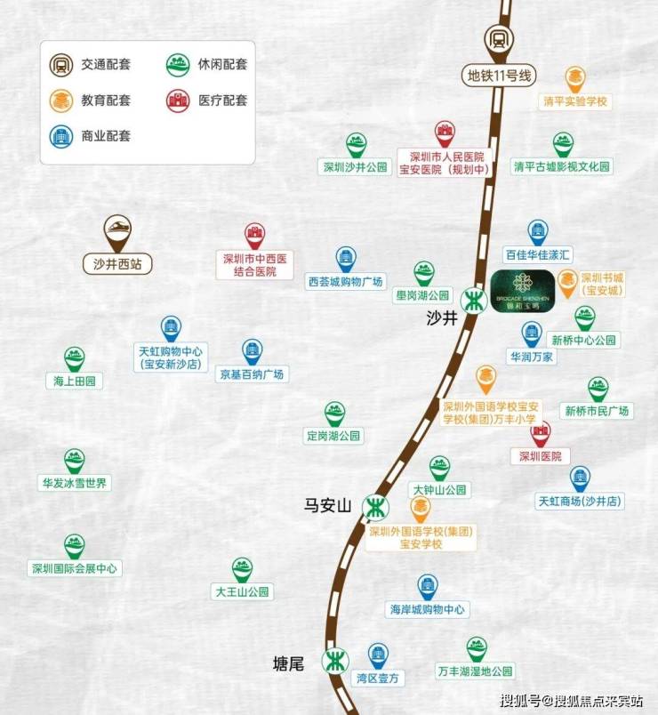 交通配套:锦和玉鸣府距离地铁11号线沙井站C、D出口仅约400米,步行约7分钟可达。从沙井站出发,2站可到达机场东站换乘1号线,8站到宝中,10站到前海,15站到南山高新园,通勤效率极高。