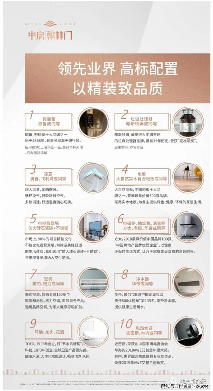 品牌瑧装:中央空调(美的、格力或同等)、入户装甲门、智能锁(耶鲁或同等);厨房三件套(方太、老板、华帝或同等);垃圾处理器(唯斯特姆或同等);马桶、龙头、花洒(科勒、TOTO、贝朗或同等)、电热水器(史密斯、林内或同等);