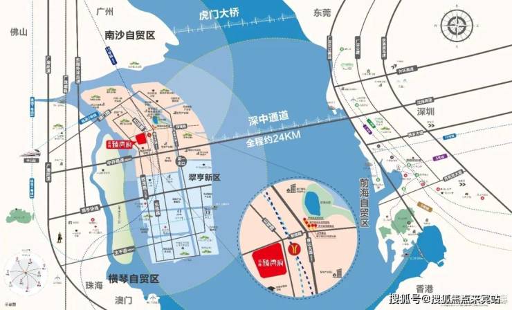 深中通道(在建中)全长约24公里,是集“桥、岛、隧、水下枢纽互通”于一体的世界级跨海交通集群工程,预计2024年6月28日全线通车,信息来源:翠亨新区公众号。一桥飞架,改写珠江口两岸融合发展格局,深中通道(在建中)将深圳至中山约80分钟的车程缩短为约30分钟(信息来源:翠亨新区官网),加速深中同城,实现工作在浅海,居住在西岸,生活自由切换,实现两岸同频发展,共荣繁华。