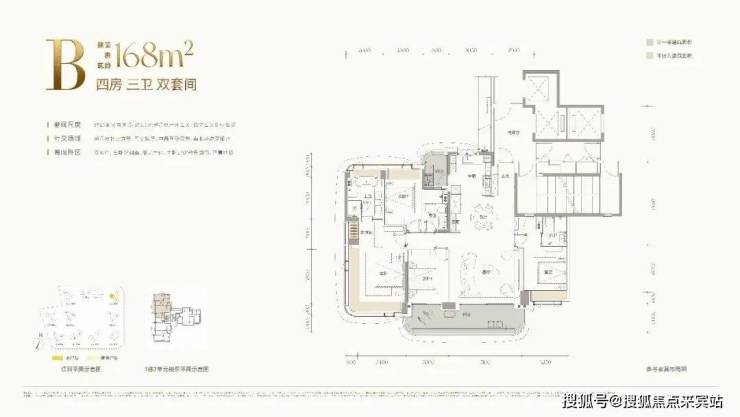 B户型:建面约168㎡四房三卫双套间,主阳台开间约:8.2米,客餐厅开间约:5.2米,3梯3户,专属电梯厅,南北通透的格局,通风采光好,满足三代同堂的居住需求,西南朝向看小区园林景观,更安静更私密,小区园林会采用立体式花园加中央水景的设计,非常漂亮。在深圳改善市场中堪称“起步即舒适”的标杆户型,动静分区清晰合理。户型核心亮点为双套间设计,主卧与一间次卧均配备独立卫浴,私密性拉满;客餐厅一体化连通巨幕阳台,采光面开阔,无论是摆放大尺度沙发,还是打造亲子互动区,空间都绰绰有余。另外两间次卧尺度适中、功能灵活,可随心改造为儿童房、客房或书房,满足多元家庭需求。整体空间零浪费、高利用率,将功能性与居住舒适度完美平衡。