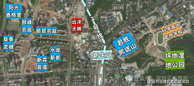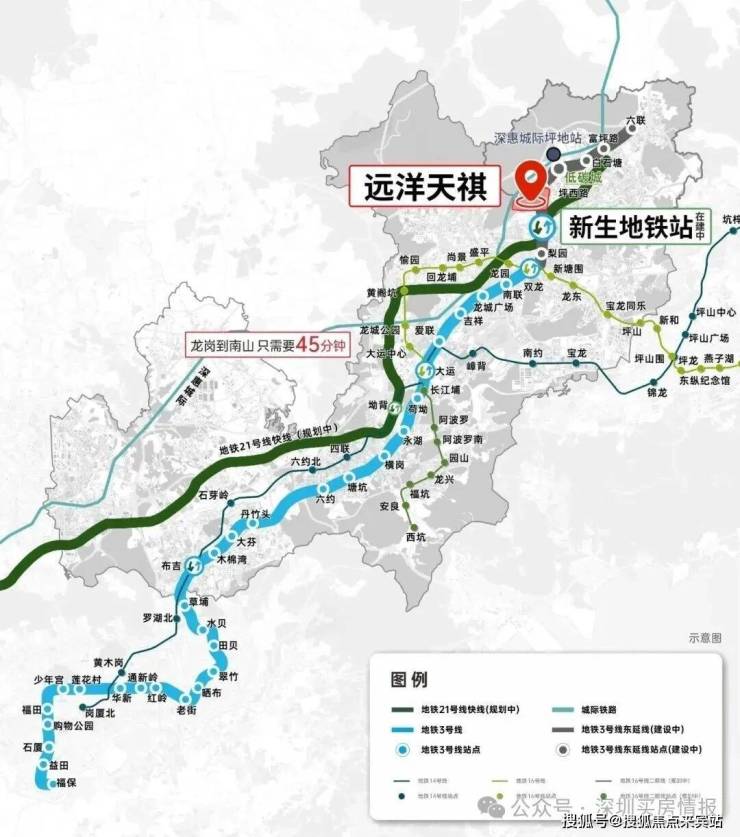 远洋天祺距离地铁3号线东延线和21号快线双轨交汇“新生站”直线距离仅约500米,是片区离地铁最近的在售项目,未来还有深惠城际前海保税区至坪地段,全长58公里,时速160公里/小时,以后从项目到南山、前海也很方便快捷。