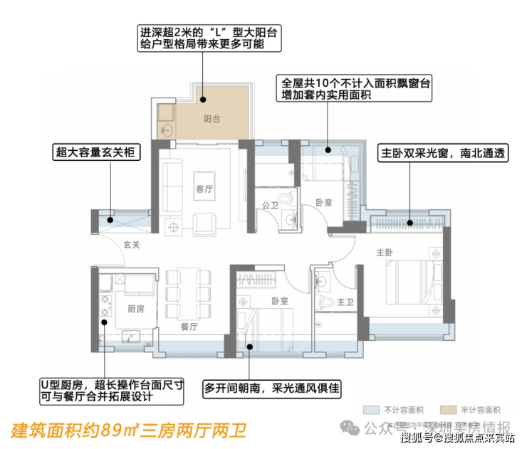 建筑面积约89㎡户型,有10个飘窗;LDKB一体化设计。U型厨房,动线短且方便,还贴心预留双开门冰箱位;主卧套房设计,并且实现了南北通透,次卧与公卫也可以组成类套房,三代人同住也能保证各自的独立空间。