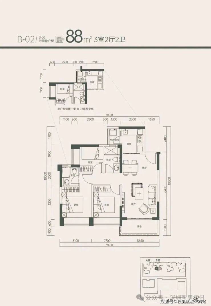 3、88㎡ 3房 单价7.48万/㎡起 总价659万起 (5楼2套)