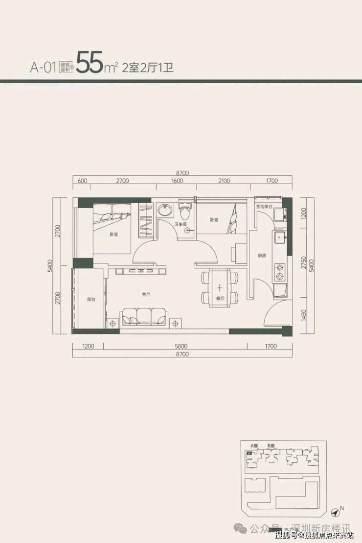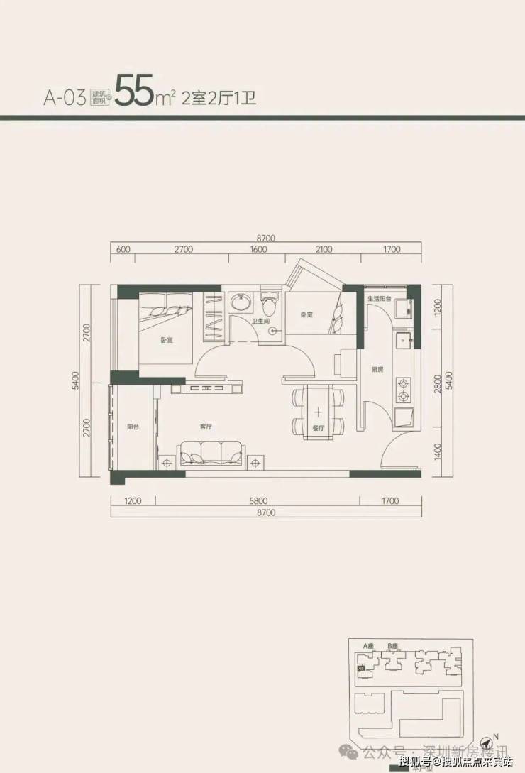 1、55㎡ 2房 单价6.8万/㎡起 总价373万起 (5楼4套)