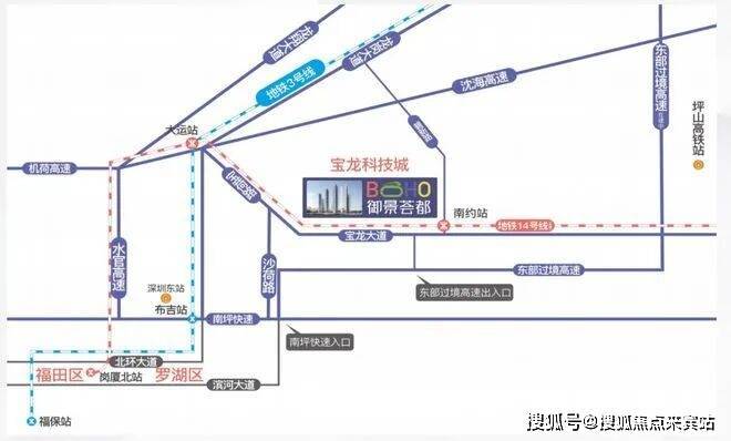 项目直连地铁 14 号线 南约地铁口(规划中 31 号23 号线),2 站大运、9 站福田中心,未来可享四地铁交汇利好;沈海高速和东部过境高速南北贯穿直通罗湖,无缝连接福田、南山;坐享地铁、铁路交通、公交枢纽等多维交通体系,快速通达深圳中心城区、香港及周边城市,高效链接都会生活圈。