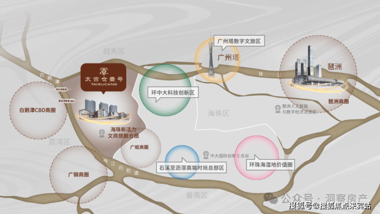 太古仓壹号坐拥老中轴延伸优势,串联白鹅潭商务区、聚龙湾综合体和太古仓文商旅圈,形成"水陆双循环"的顶级商圈格局。琶洲、白鹅潭、广钢、广纸等四大繁华商圈环绕,人文与艺术交相辉映,孕育全球前沿水岸生活的世界橱窗。
