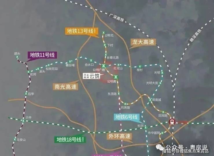 深业云筑,位于深圳市光明区公明街道马田街道石家社区,地处光明科学城大科学装置区,是粤港澳大湾区核心区域及广深科技创新走廊重要节点,承接南山区科技外溢,毗邻东莞松山湖,区位优势显著。项目紧邻地铁6号线公明广场站(1.1公里)及在建13号线公明南站(约700米),未来可直达南山科技园、后海总部基地;周边龙大、南光高速无缝衔接福田、南山,交通便捷