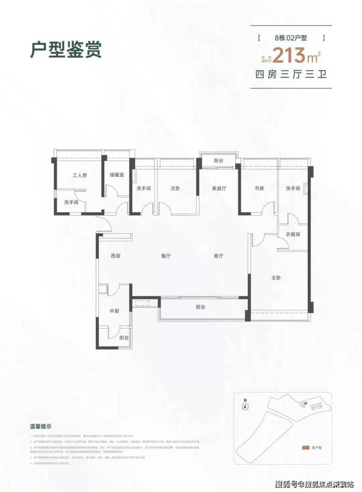 213㎡的4房3厅3卫,设计的是横厅南北通透格局,一梯一户,进门入户玄关,LDKB一体化设计,四开间朝南,双阳台通透,主卧大套间设计,还配有保姆独立套房,中西型多功能厨房,卫生间干湿分离,得房率约82%(不含赠送),阳台主朝东南向。