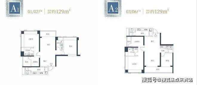 129㎡的3房2厅2卫:有2个户型,分别是西北,东南朝向,都是是双龙抱珠格局,其中A2(03/06)户型客厅超大观景阳台(近7米)舒适大三房设计主卧都享有270度采光面,整体空间尺度感大且采光面充足,视野非常宽阔。