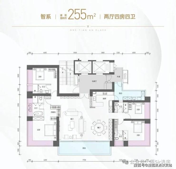 255㎡的4房2厅4卫,1栋1单元01/02户型,设计的是竖厅双龙抱珠格局,专梯入户送超大私用入户空间,客厅9.7米开间,LDKB一体化设计,主卧带大衣帽间,三套房设计,分别做到了主卧34.02㎡/次卧24.18㎡/次卧18.3㎡/次卧15.16㎡(包含墙体飘窗),客厅连接餐厅出9.7米长的大阳台约22.31平,J型厨房带1个生活阳台约12.27平,卫生间干湿分离,得房率约96.7%(包含赠送,不含入户空间),西南或东北朝向。飘窗赠送面积24.8㎡+阳台赠送17.29㎡=实际赠送42.09㎡(不含电梯入户空间)。