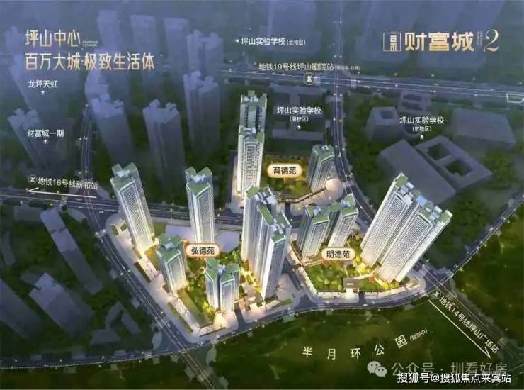 【财富城二期】是整个坪山最核心的地段,汇聚了高铁、三条地铁、两所学校、一个公园和六馆一城等全方位的生活、市政配套,当之无愧是坪山最适合居住的片区。