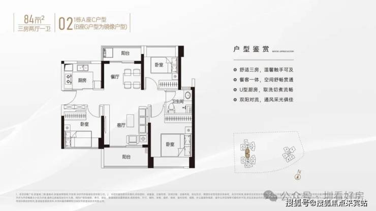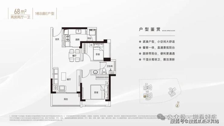 竖厅南北通透格局,客厅3.4米开间,客餐厅双阳台分离化设计,U型厨房,卫生间干湿分离,得房率约79%(不含赠送),客厅阳台主朝东北向。
