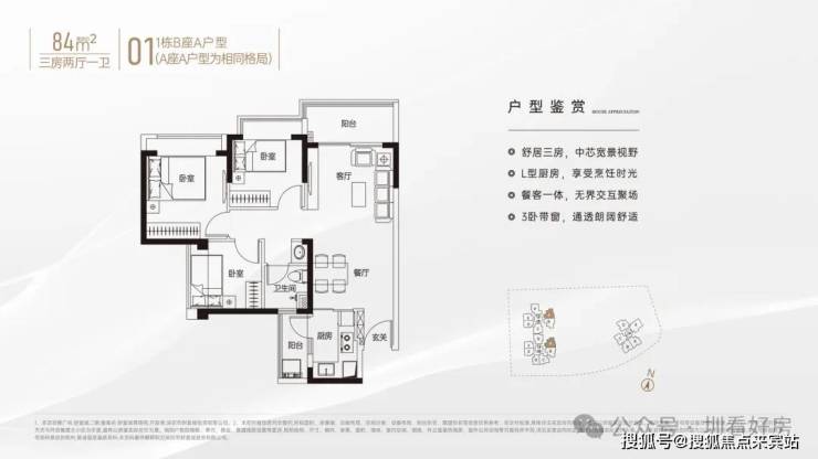 竖厅格局,客厅3.4米开间,LDKB一体化设计,动静分区,L型厨房还带1个生活阳台,卫生间三段式干湿分离,得房率约79%(不含赠送),东北朝向。
