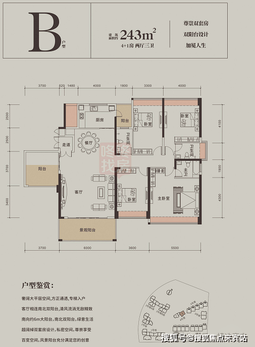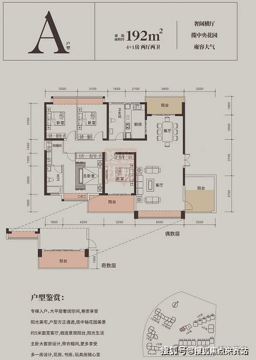 在售户型:A户型192㎡4+1房 、B户型243㎡4+1房、叠墅188㎡、235㎡、634㎡