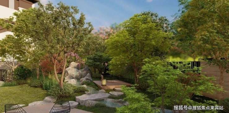 园路铺装选用天然青石板与锈石板交错拼接,在雨后会呈现出独具韵味的青灰色渐变效果。