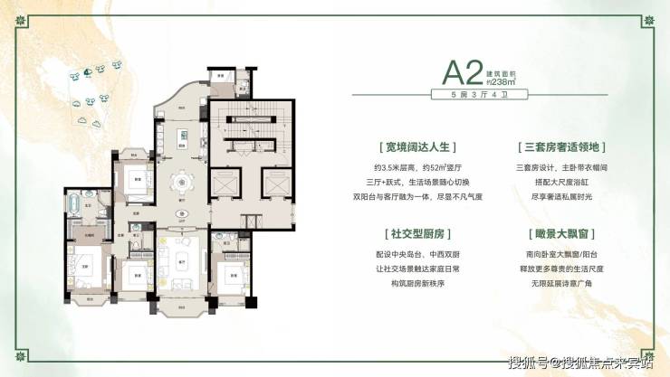 ② 是小区 200㎡+ 大户型中唯一的非跃式户型,空间布局通透齐整,没有上下层楼梯的设计,老人日常活动更方便,兼顾大空间与实用性。