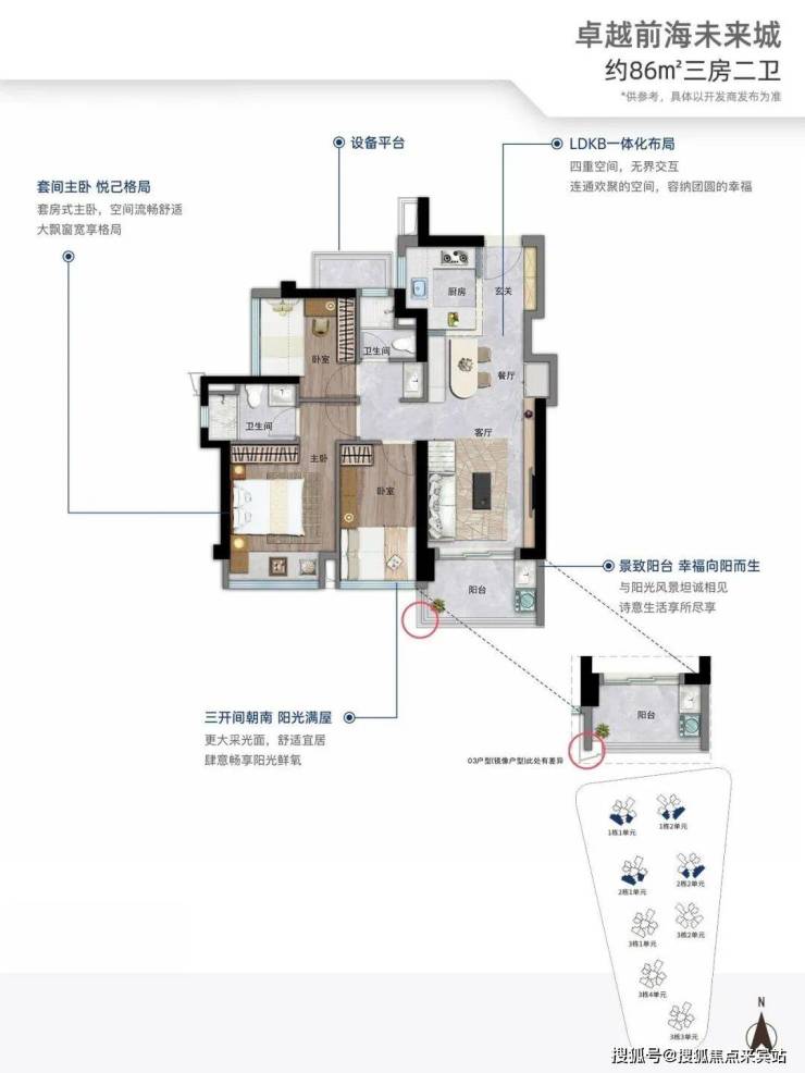 86㎡的3房2厅2卫,折后总价313-324万/套,折后单价3.63-3.73万/㎡。