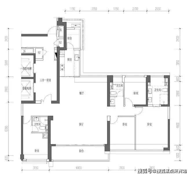 169㎡户型:4房2厅3卫,竖厅格局,2梯2户,专梯入户,得房率约68.58%(不含赠送),正南朝向。