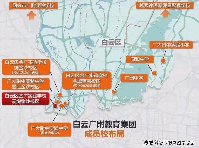目前,白云广附已成为拥有多所学校的大集团,在金沙洲内,有广大附中实验中学南校区、北校区,金广实验学校金域蓝湾校区、御金沙校区、越秀·天悦金沙校区(建设中)。