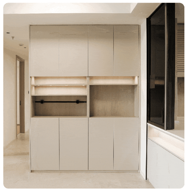 润臻园的收纳不是“打柜子”,而是“把每个角落都变成储物间”。89平E户型送7.7m³定制柜,相当于15台双门冰箱的容量,有娃家庭也能保持客厅空旷!