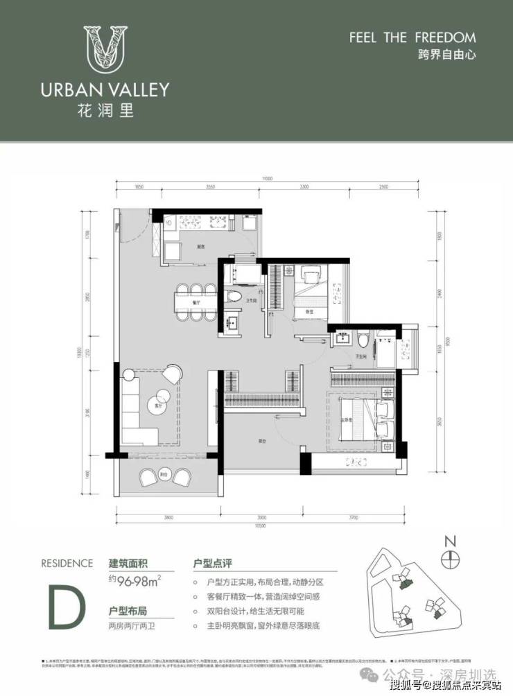双阳台双卫设计,约3.5m舒适客厅开间,宽厅空间阔绰,动静分区,户型方正实用。