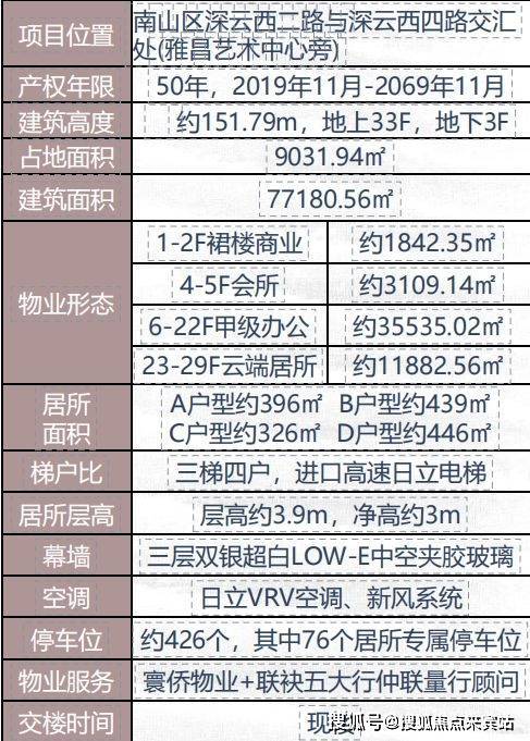 【寰侨观邸基础指标】楼层分布:23至29层,层高约3.9米。采用三层双银超白LOW-E中空夹胶玻璃幕墙。物业收费标准为每平方米每月12元。项目位于中国深圳华侨城,具体地址为深云西路二路与深云四路交汇处。