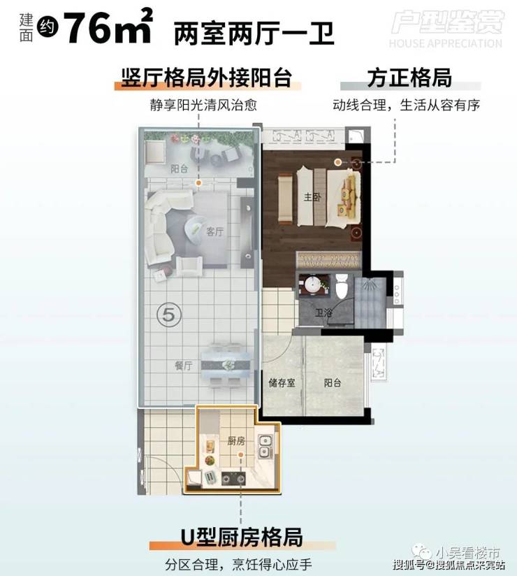 建面76平北向两房一卫,在售南区,常见竖厅设计,U型厨房,厅出阳台,进屋独立玄关,超长餐边柜。