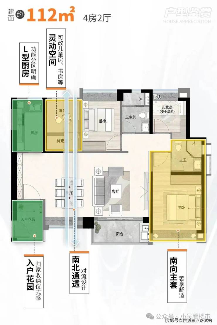 建面112平四房两卫,一步到位四房,四开间朝南,南北对流,LDKG一体化设计,8米大横厅,阳台看中心园林,整个生活区都没有暗角,在售南区,北区。