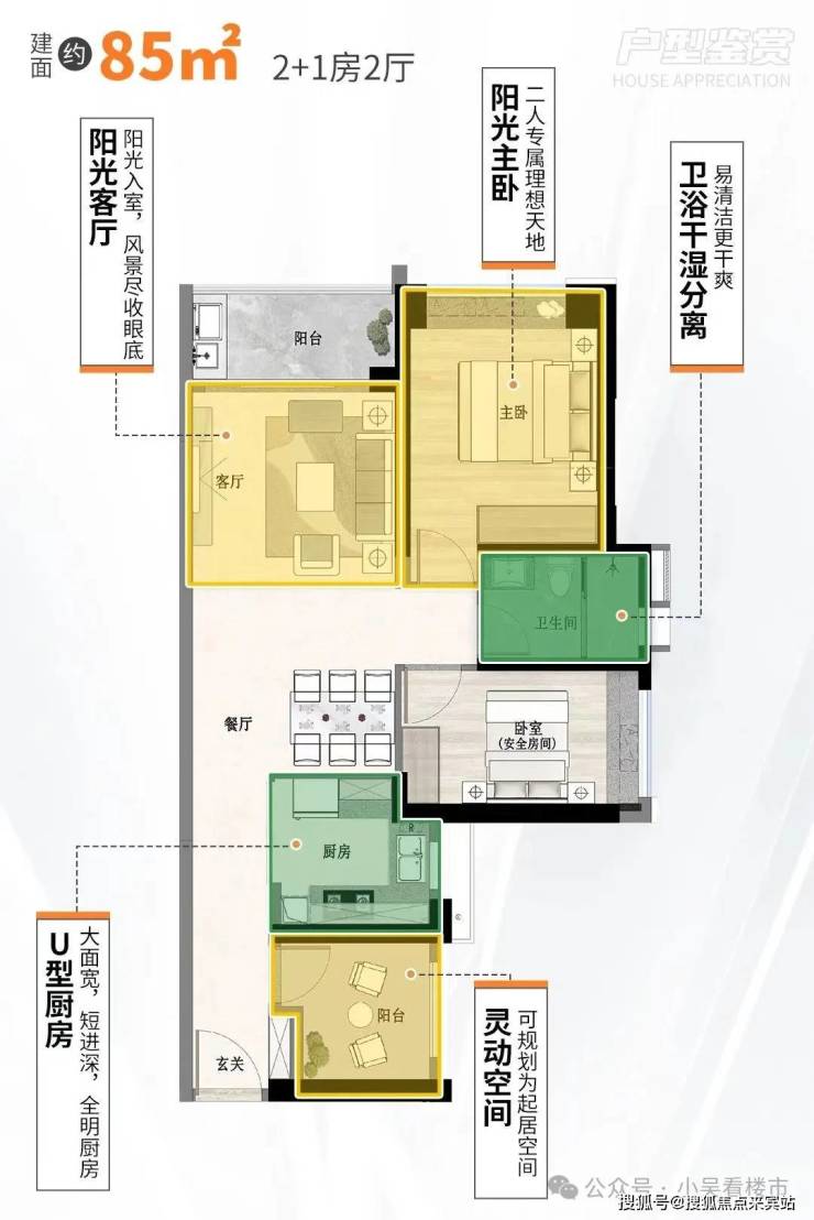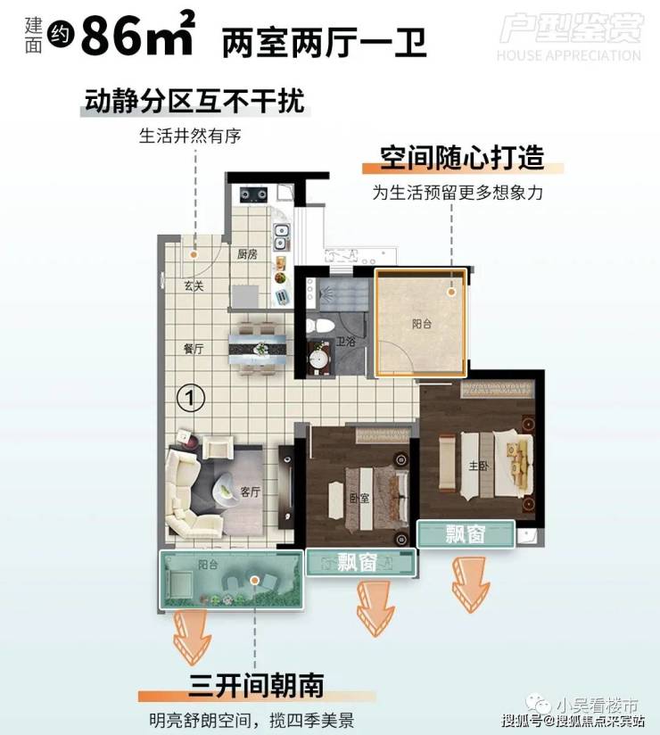 建面86平三房一卫,南向,项目将厨房一面墙设计为非承重墙,三开间朝南设计,在售北区和南区。
