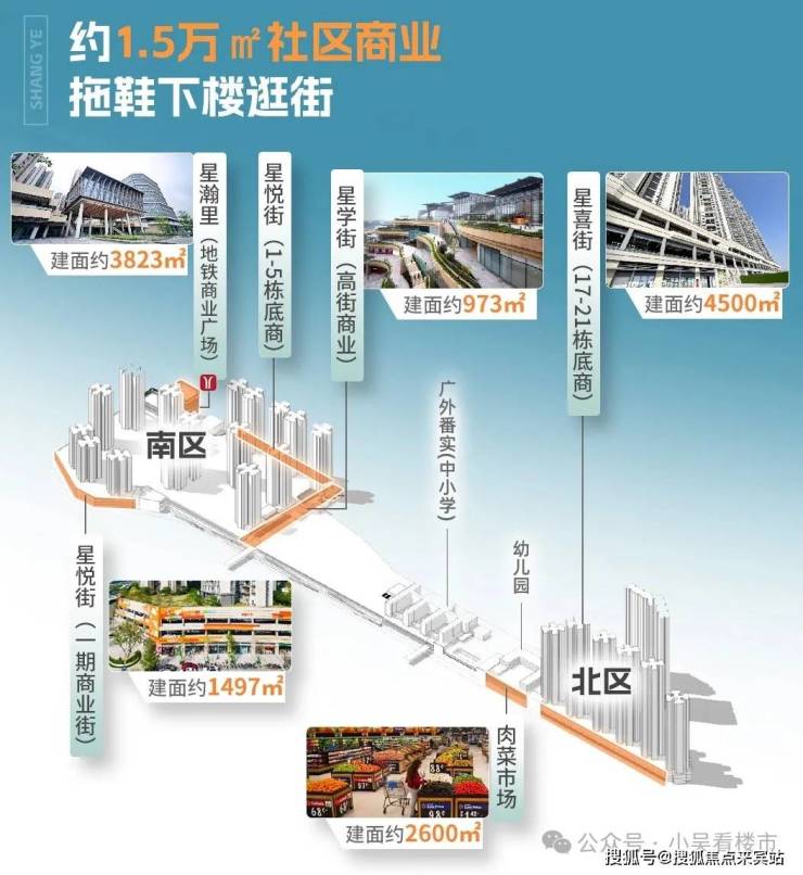项目自身带1.5万方商业街,北区有底商、肉菜市场,南区则有地铁商业广场、商业街,业主下楼就能逛街、吃饭,大型商业的话需要去到万博,驱车不到20分钟,万博有广州第一家开业的山姆会员店、万达广场、天河城、四海城,还有K11、万象城在建中,商业配套非常丰富。