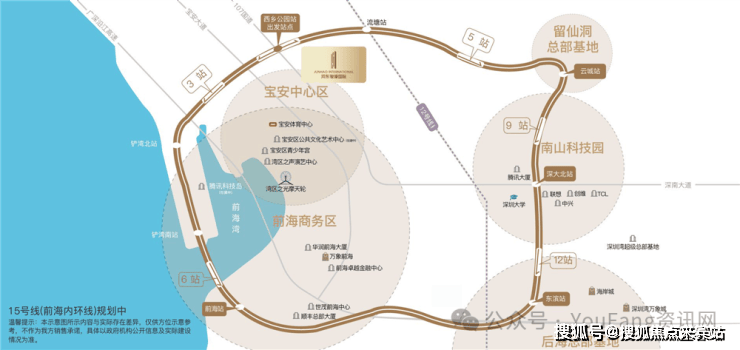 地铁15号线(规划中)作为深圳首条环线轨道,起终点均为前海站,作为战略上的“产业线”,极速串联前海、宝中、大铲湾“腾讯科技岛(在建中)”、南山科技园、后海总部基地、留仙洞总部基地等高端产业密集区,推动资金流、人才流、技术流汇聚,构筑“前海内环”经济大动脉。