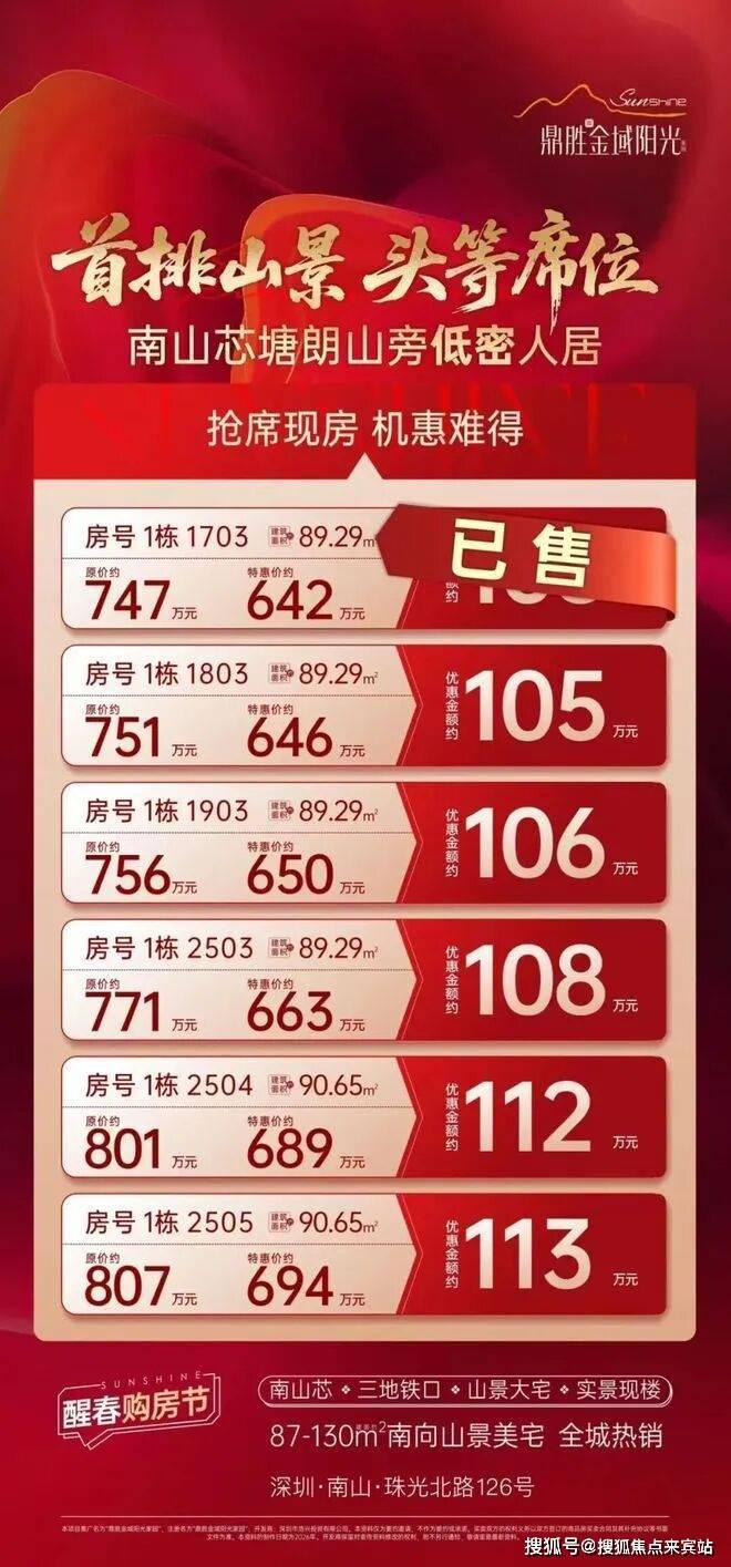 鼎胜金域阳光凭借低密山景、现房属性与高性价比,成为南山刚需改善热门,短板是社区规模较小、含53套回迁房且混居,圈层不够纯粹,周边界面一般,部分户型受主干道及施工噪音干扰。优先推荐预算620万以上、南山通勤、看重现房与生态环境的刚需改善家庭。如需了解更多详情或预约看房,可拨打官方售楼处电话:400-859-7606,开发商直营热线,24小时在线,无中介打扰,可预约实地看房,本文信息是2026年4月实时更新,开发商直营,无中介打扰。