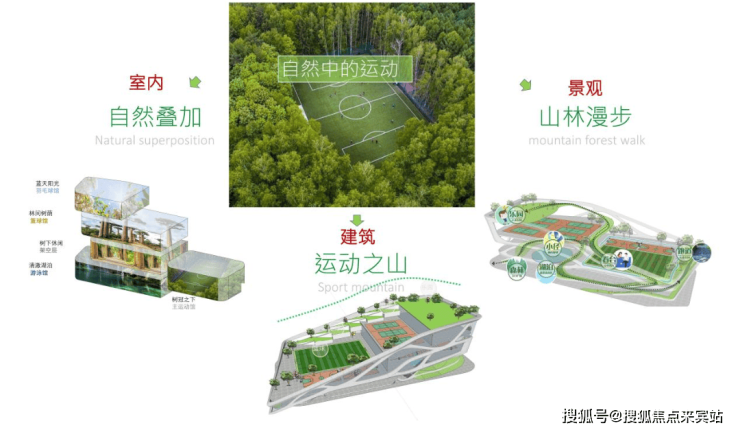 在建筑、室内、景观设计中分别融入了“运动之山”“自然叠加”“山林漫步”的设计思想,合理满足各种运动功能需求。