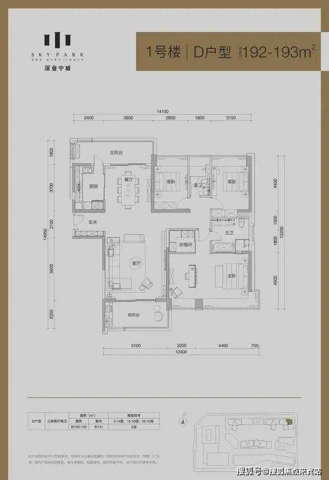 1栋:产品是面积段为137-185-192㎡的3房、212㎡的4房、以及4套300㎡以上的顶层复式单位,其中36层及以下为2梯3户“品”字形结构,37层及以上为2梯2户的板楼结构;