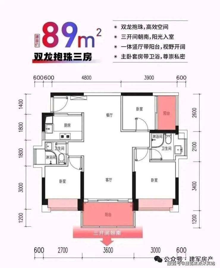 2、户型:建筑面积约89㎡三房两厅两卫,东南朝向,双阳台,主卧套房设计
