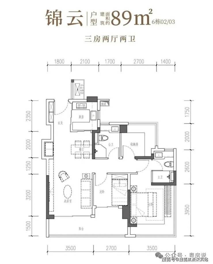以LDKB无界场域盛放温情,以阳光长廊安放志趣,更以270°环幕主卧,升华为奢适的私密天地。• 锦云·建面约89㎡3房2厅2卫:南向阔厅,景致常驻,间间开阔,尺度舒适