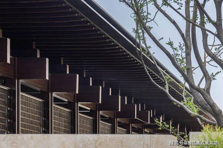 屋檐参考了中国古建筑的木构形式,采用双层不对称的重檐,