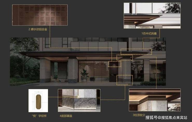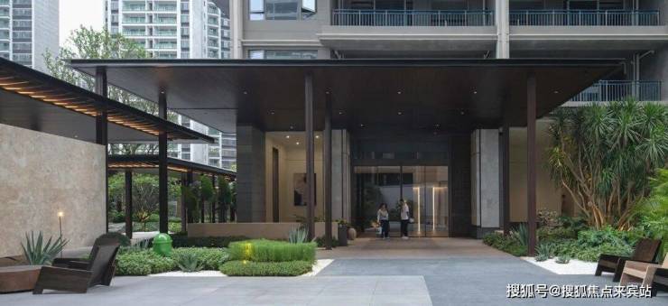 入户单元门头整体和小区入口大堂呼应,顶部强调轻薄精致的挑檐,两侧采用大象灰石材哑光面和拉槽面,搭配定制蟒水纹金属网,尊贵而不失精致,大面积采用的浅灰色材料跟出挑舒展的雨棚,营造出轻松写意的度假感。