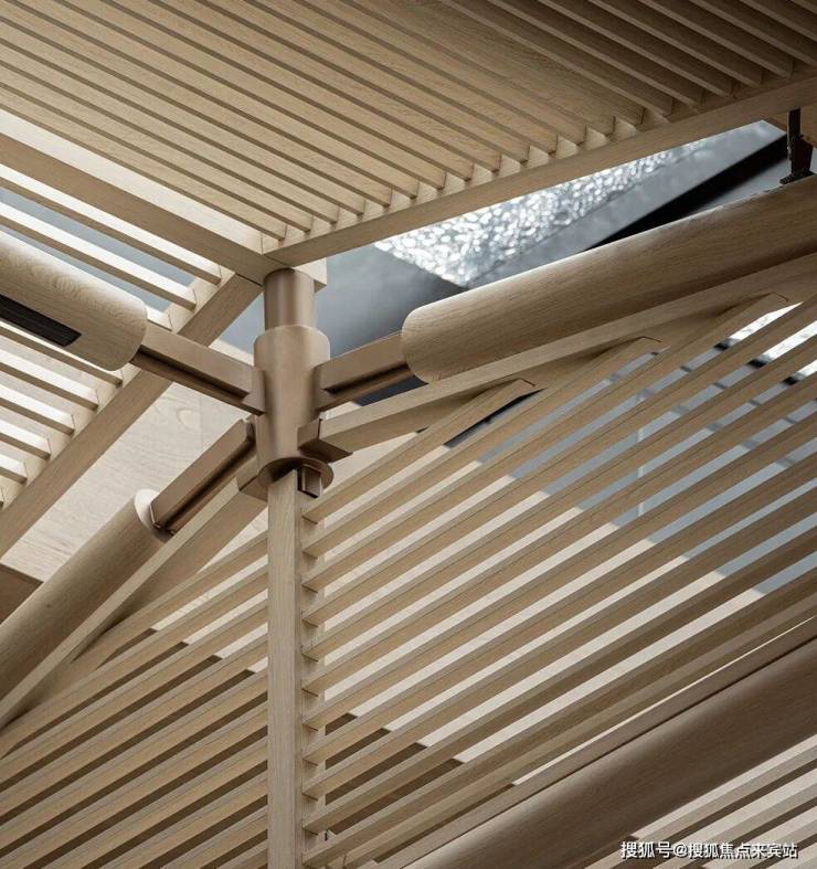 天花的造型采用非遗文化工艺榫卯结构,一榫一卯相互接驳,是木件间高与低、长与短之间的巧妙组合,不仅为开放式的洽谈区提供了一份空间的律动感,更凝结了中华千年文明的深邃智慧。