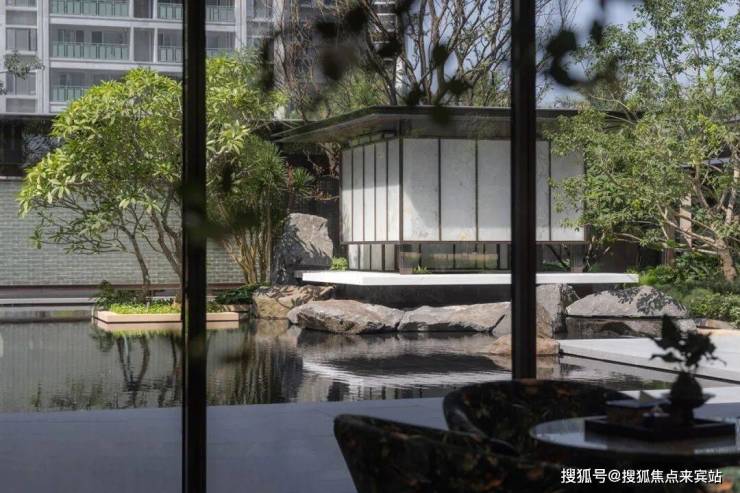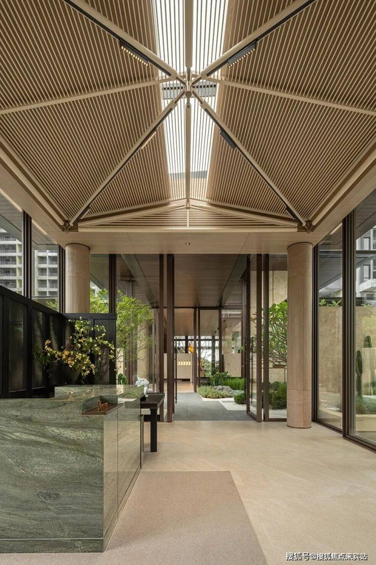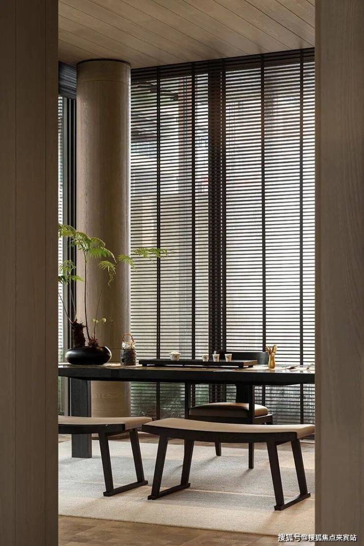 “但远山长,云山乱,晓山青” 国画山水中走出的线条风骨,极简的建筑线条,大面积的通透玻璃,配合“山水画框”式的设计元素,传统东方山水画卷构图的现代转译