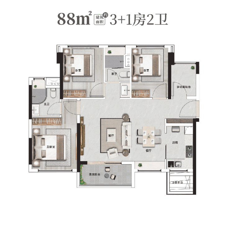 约88㎡3+1房:南北对流双选择,主卧套房配置,380万级性价比之王