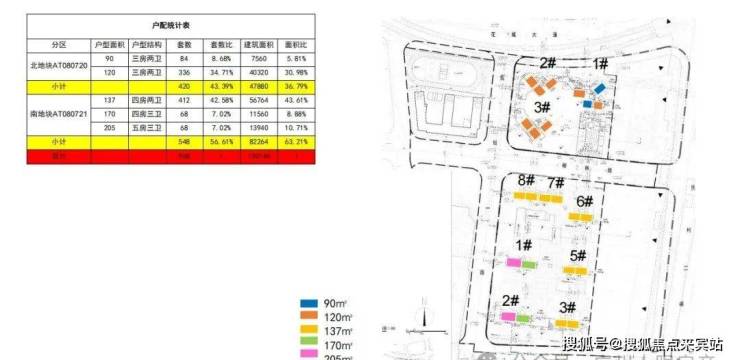 而保利天曜北地块规划了3栋住宅,2梯3户和2梯4户,其中1栋有两条梯腿是90平小户型产品,另外还有两条梯腿是120平产品,2栋和3栋则都是120平的,北地块容积率3.5,预计40层高超高层,