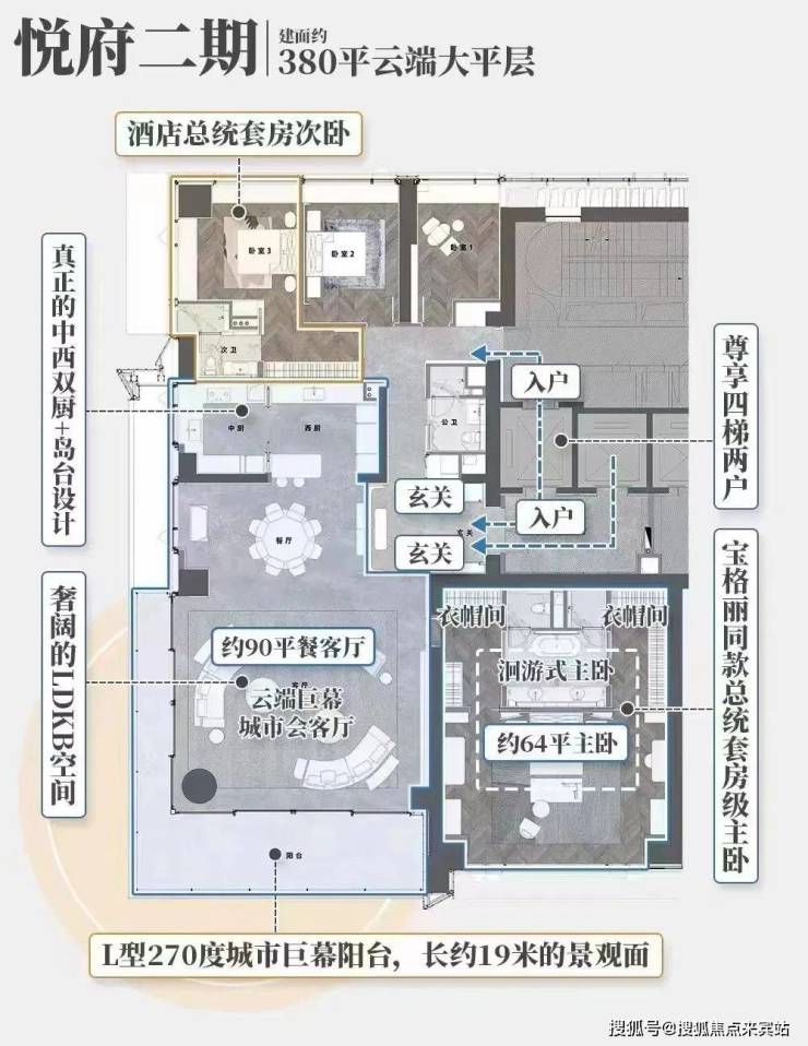 约3.5米殿堂级层高,约90平米客餐厅;约19米转角阳台;超60平米酒店式主卧。