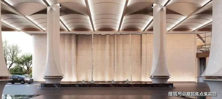 项目车行大门做了殿堂级落客区,设有天幕和水景,非常具备归家仪式感。