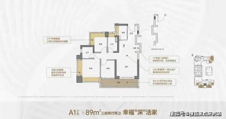 竖厅格局,客厅3.5米开间,LDKB一体化,S墙设计预留冰箱卡槽位,客厅连接次卧出5.9米长的大阳台,主卧双面飘窗,次卧270°转角飘窗,全屋6面飘窗,U型厨房,卫生间干湿分离。