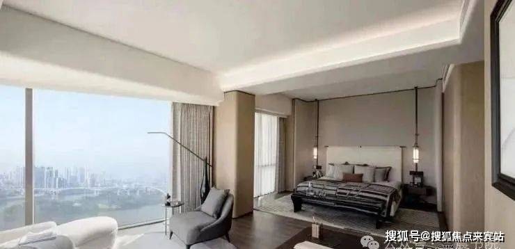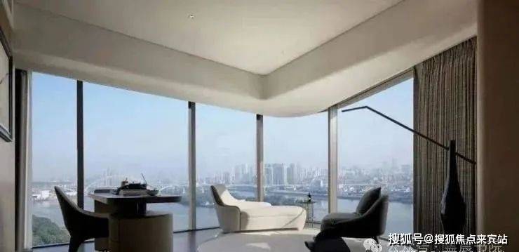 临江面采用大面积落地玻璃窗,环幕江景,270°立面转角全景落地窗,犹如海上行宫床头舱,江景视觉比客厅更佳。据闻,为了保持玻璃和石材的弧度,营造零瑕疵的天幕视野,不惜成本造价,耗费足足4个月的时间才完成安装。
