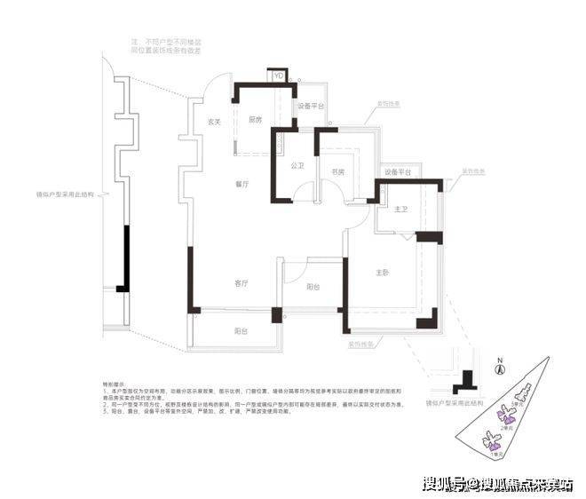 竖厅动静分区,S型墙内嵌冰箱位,“阳台”和“书房”处实际可以做房间。