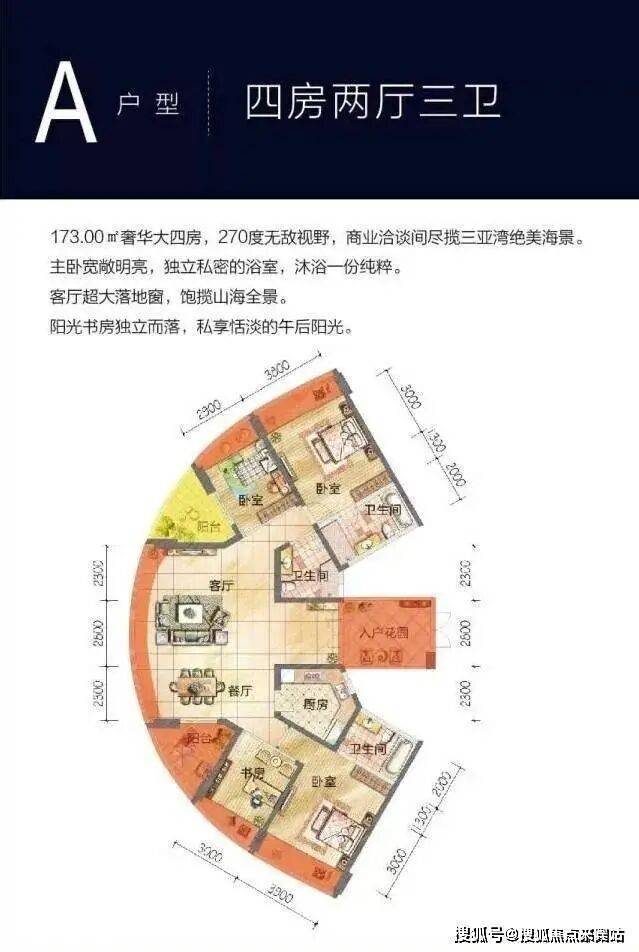 173.00㎡奢华大四房,270度无敌视野,商业洽谈间尽揽三亚湾绝美海景。主卧宽敞明亮,独立私密的浴室,沐浴一份纯粹。客厅、餐厅、景观阳台三位一体,既可与家人品味佳肴,又可邀约朋友高端人士欢聚一堂。