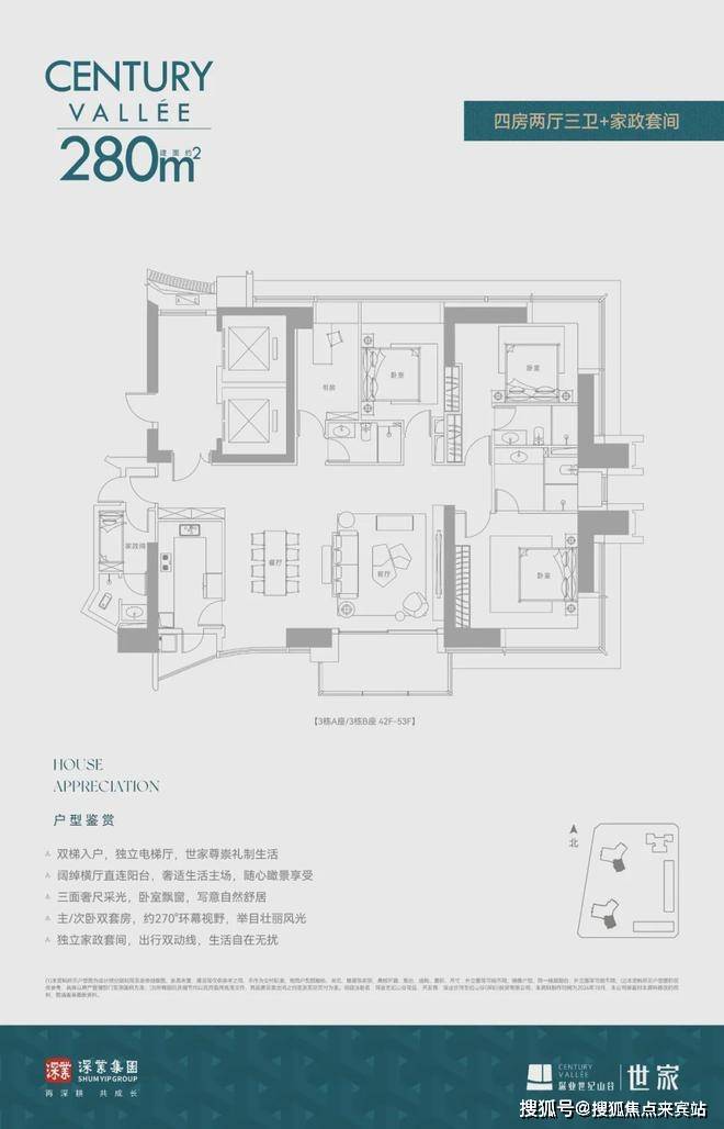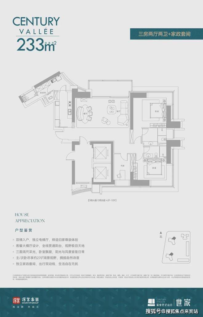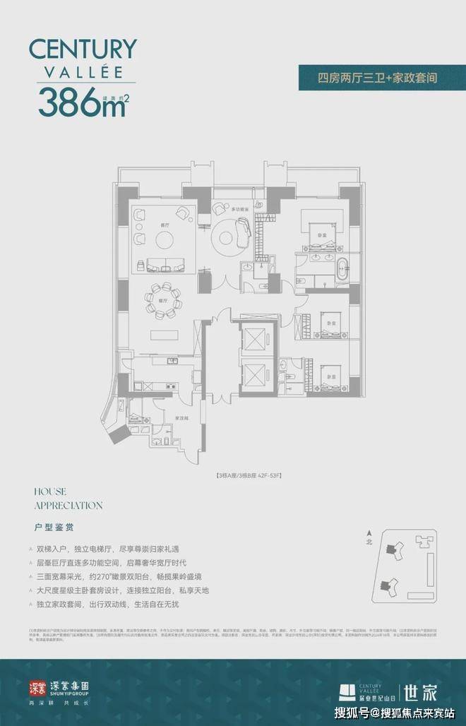深业世纪山谷·世家主推建面约233/280/386m²纯粹大平层户型,高区还有少量建面约420-1080㎡墅级顶复。