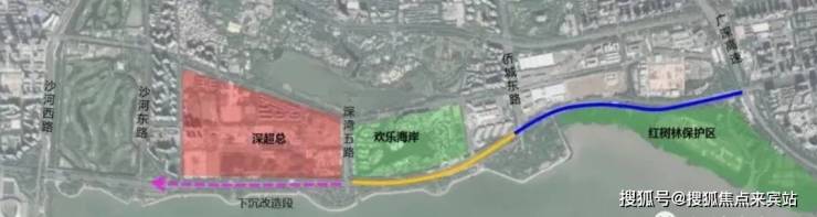 滨海大道(总部基地段)交通综合改造工程西起沙河东路,东至广深高速滨海立交。改造路段全长约6公里,全线按主路双8+辅路双6进行改造,其中下沉隧道长约1.2公里,下沉隧道与高强度开发地区交通组织衔接形式采取多点进出,主、辅路均原位下沉,主线平铺浅埋,辅路竖向分层